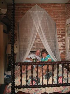 | anne told us earlier that mosquito netting was a fixture on all beds 'til the 60's, since buildings don't have screens & are left open as much as possible during warm weather. we've easily noticed that there are mosquitoes here in louisiana. |