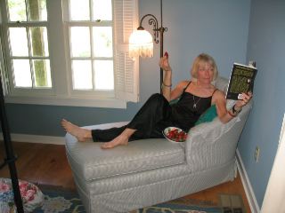 | the cottage that roma, sari, & i share is the newest one. it has a nice living area with high ceilings, a fireplace, kitchenette, nice bedroom, & a bathroom with a double-sized jacuzzi tub, up&down washer/dryer unit, & a walk-in closet. 3 double doors open out onto the porch that spans the front of the cottage. (i took yesterday's photo of the peacock from our porch.) this afternoon, roma, an avid reader, made good use of the chaise lounge in the bedroom. |
