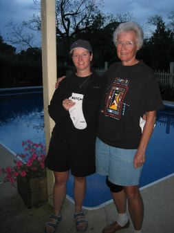 | then marilyn boger presented the BITCH socks to kathy grubb, on the left in this photo. the new acronym label is: Boyfriend Inspires Toughness, Courage, & Heart....referring to kathy's boyfriend, whose picture she carries in her bike's map case. (behind them is the pool outside the "pool house" cottage.) |