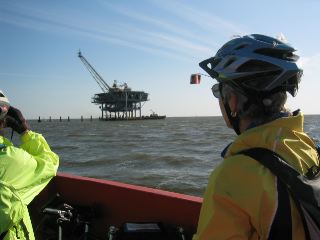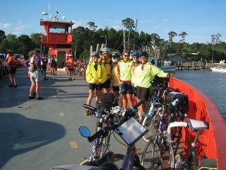 | once the few cars lined up for the ferry drove onto it, they let us bikers walk our bikes on. it was a beautiful day & a lovely boat trip across mobile bay....very smooth, except for a few dips when we hit higher waves; one wave even came splashing over the front of the ferry, dampening a biker or 2 standing in that spot. |