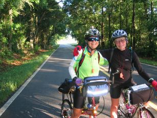 | after leaving the motel, we quickly got off the busy roads & turned onto the county roads on which we would spend most of the day. in this photo you can see the way the sunshine thru the canopy of trees dapples the roadway behind sari & roma. |
