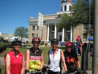 | we passed thru the pretty little town of chattahoochee in the morning, then midday we came to the town of quincy at about 48 miles into the day's route. (we'd already passed into the eastern time zone, so we lost an hour this morning.) there were beautiful homes along some of the the streets we traveled. before long we came to the town square. quincy is evidently the county seat of gadsden county. in this photo, from left, gay, laura, kathy groen, & catherine are standing in front of the court house. |