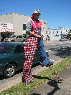 | the tall clown who was part of the carnival came loping in our direction. he leaned against the top of his car to adjust his leg extenders. when i asked if i could take his photo, he stood up & hiked up his left pants leg so you can see the mechanism he uses to become a giant. |