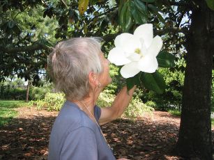 | along the street were some beautiful restored older buildings & some lovely plantings. in one front yard we saw a large magnolia tree. here's a photo of sari smelling a huge magnolia blossom that's almost as big as her head. |