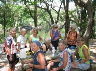 | several of us went a bit off route to the suwannee river state park, where we found a picnic table down by the river's edge & enjoyed lunch from our bike bags. in the photo, from left in front, are loralee, frances, & becky; in the rear from left: sari, roma, rita, bev (seated), patty fainer, & marilyn boger. we all enjoyed a serenade by patty playing stephen foster songs on her harmonica. |