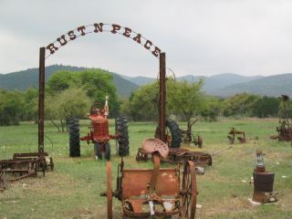 | a bit further along we were riding along a relatively flat stretch with pastures & some ranches on both sides of the road. we came upon this farm-machinery cemetery, so i took this photo of it. there was lots more rusting machinery in the pasture than you can see in this photo. |
