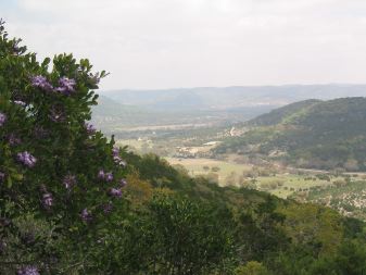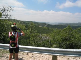 | we had 2 very steep climbs today....& 2 very steep descents, along with plenty of smaller (but steep) climbs & descents thrown in between. here's a photo of sari near the top of the first climb...looking back toward this beautiful texas hill country that we were cycling through. |