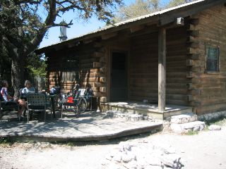 | it turns out that vanderpool is a teensy, old store at the intersection of 2 ranch roads. we turned left there & rode 3 additional miles to foxfire cabins. it's so pretty & secluded...a real shangri-la! here's a photo of sari & roma sitting on the deck outside the cabin we 3 share. |